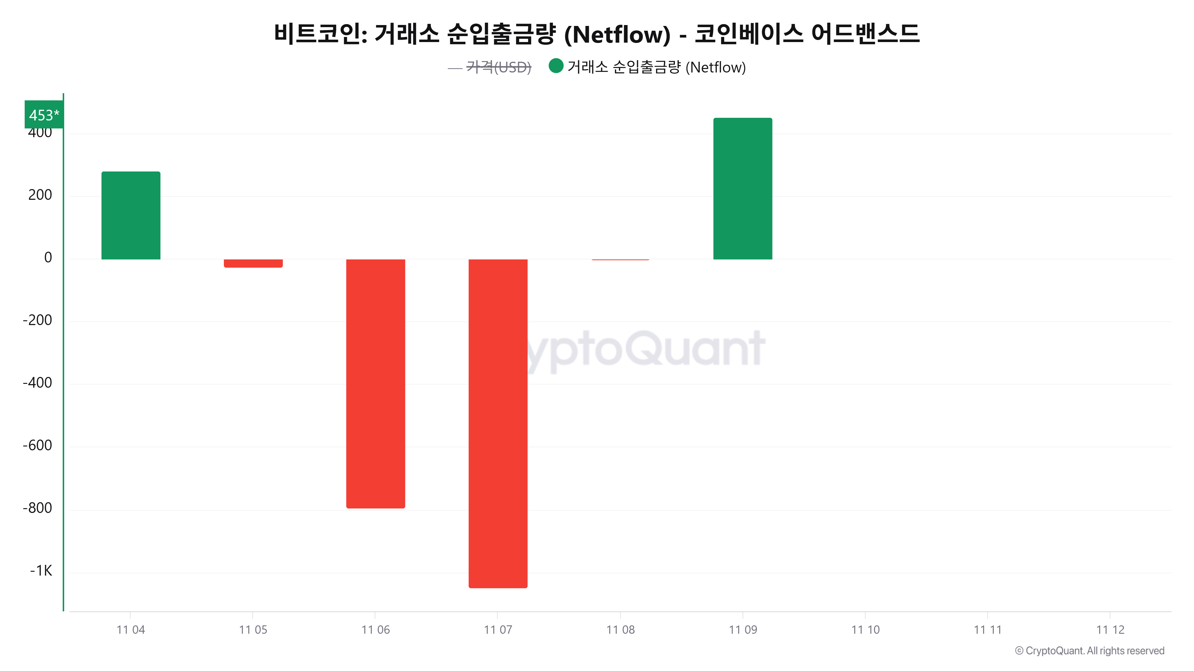 크립토퀀트 데이터에 따르면 9일(UTC 기준, 미완결) 코인베이스의 비트코인 순입출금은 453.0 BTC 순유입으로 전환됐다.