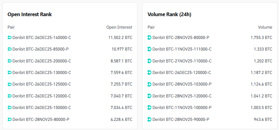 가장 많이 거래된 옵션 계약은 ▲8만 달러 풋옵션(11월 28일) ▲11만1000달러 콜옵션(11월 11일) ▲11만 달러 콜옵션(11월 21일) 순으로 집계됐다.