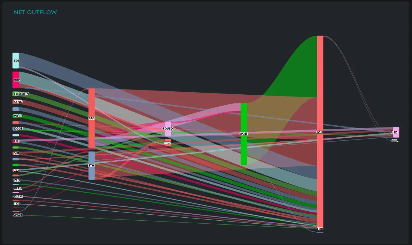 BTC에서는 2억2180만 달러가 유출돼 ▲USDT(1억5840만 달러) ▲USDC(3120만 달러) ▲FDUSD(2620만 달러) ▲원화(600만 달러)로 분산됐다. ETH에서도 1억590만 달러가 빠져나가며 ▲USDT(9550만 달러) ▲원화(1040만 달러)로 흘렀다.