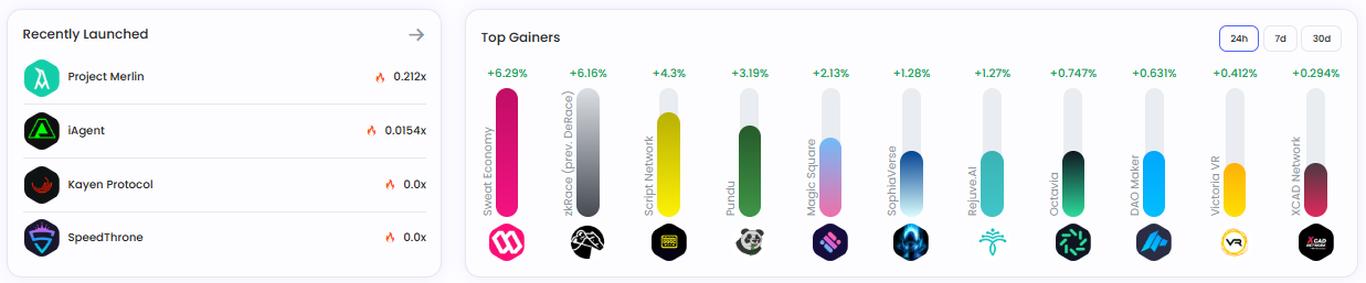 최근 해당 플랫폼에서 출시된 프로젝트는 ▲프로젝트 머린(0.21배) ▲아이에이전트(0.015배) ▲카옌프로토콜(0.0배) ▲스피드스로운(0.0배) 으로 확인됐다.