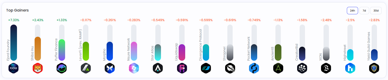 상승률 상위 프로젝트는 ▲LTO 네트워크 +101.0% ▲유니브라이트 +69.7% ▲네트워크 +43.0% ▲이더월 +27.8% ▲플리크 +25.5% ▲톡큰 +22.4% ▲세럼 +21.4% ▲신트로피 +21.0% ▲오보리AI +19.8% ▲미들 +19.4% ▲그래니텀 +17.9% 순으로 확인됐다.
