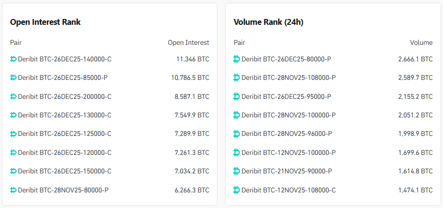 24시간 거래량 기준으로는 ▲8만 달러 풋옵션(12월 26일) ▲10만8000달러 풋옵션(11월 28일) ▲9만5000달러 풋옵션(12월 26일) ▲9만 달러 풋옵션(11월 21일) 순으로 풋옵션 거래 비중이 뚜렷했다.