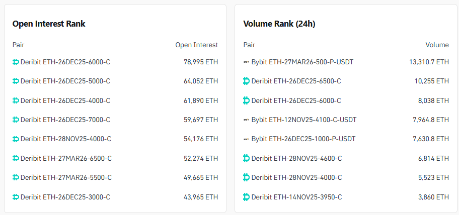 24시간 거래량 기준으로는 ▲500달러 풋옵션(3월 27일) ▲6500달러 콜옵션(12월 26일) ▲6000달러 콜옵션(12월 26일) ▲4100달러 풋옵션(11월 12일) 순으로 풋옵션과 콜옵션이 혼재된 흐름을 보였다.