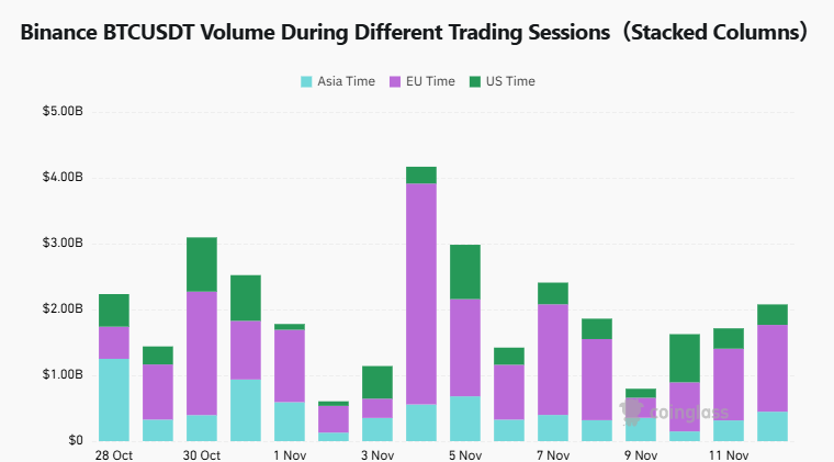 바이낸스 BTCUSDT 거래량은 아시아 시간대 4억4716만 달러, 유럽 시간대 13억2000만 달러, 미국 시간대 3억1126만 달러로 집계됐다.