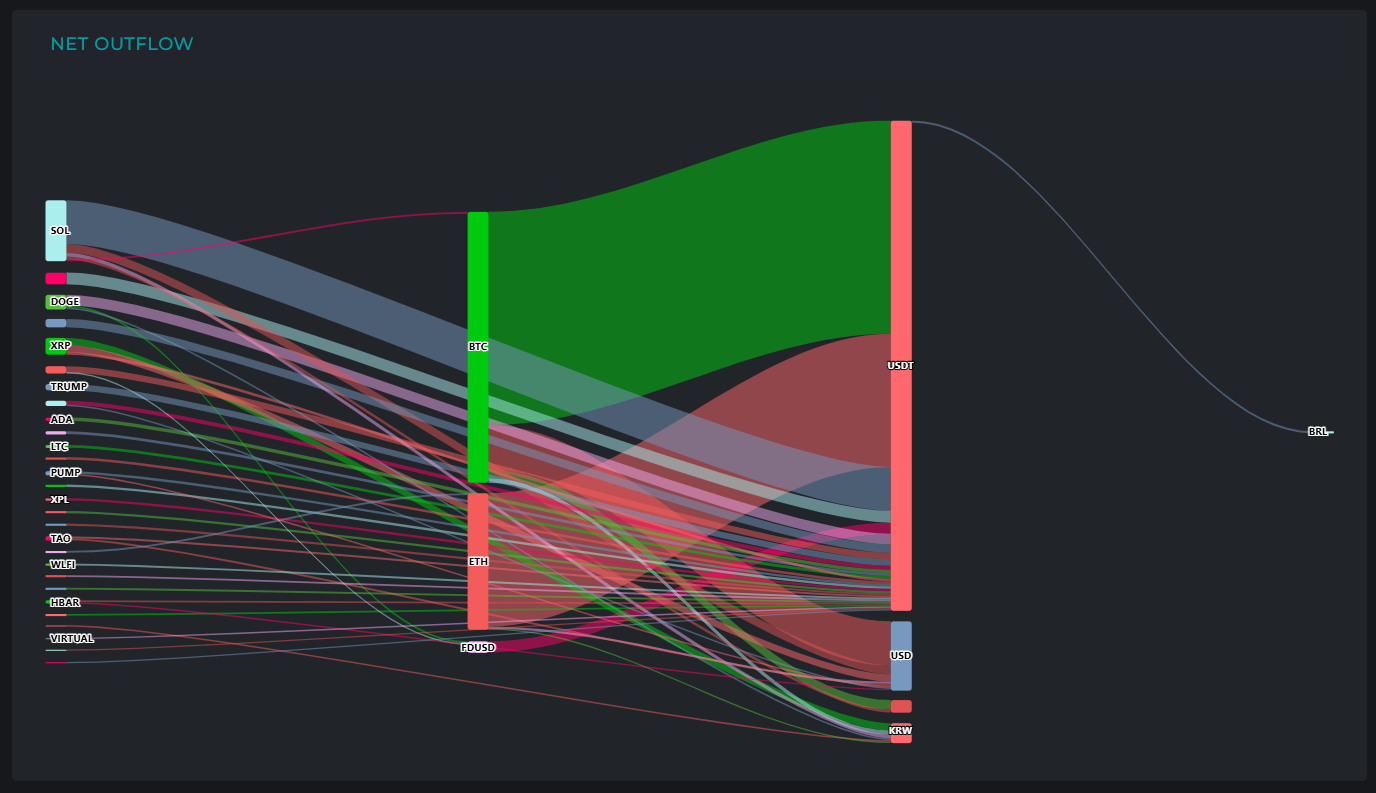 SOL에서는 총 1억7320만 달러가 유출되며 ▲USDT(1억2400만 달러) ▲달러화(2500만 달러) ▲원화(1050만 달러) ▲USDC(860만 달러) ▲BTC(520만 달러) 순으로 분산됐다.