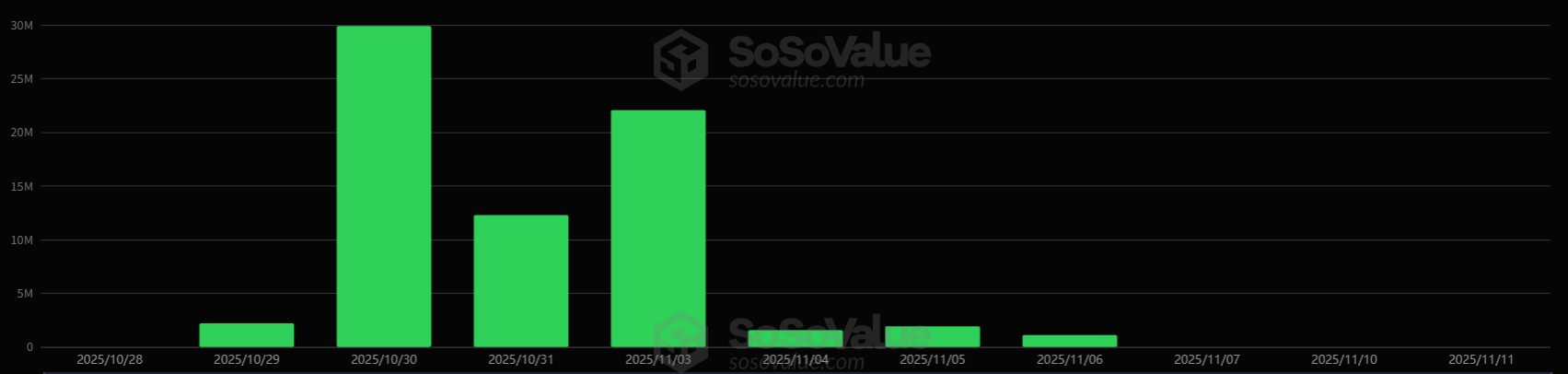 지난 6일까지 이어졌던 7거래일 연속 순유입세가 멈춘 이후 3거래일 연속 자금 변동이 없는 상태다. 현재 누적 순유입 규모는 7105만 달러로 집계됐다.