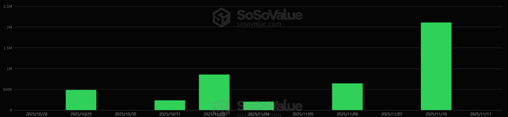 소소밸류 집계에 따르면 11일(현지시간) 미국 솔라나 현물 ETF 시장에서는 총 798만 달러(약 117억원)의 순유입이 발생했다.