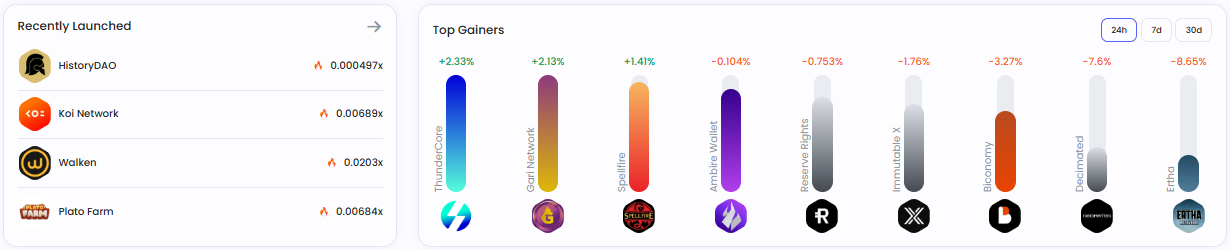 24시간 기준 변동률은 ▲썬더코어(+2.33%) ▲가피네트워크(+2.13%) ▲스펠파이어(+1.41%) ▲앰바이어월렛(–0.104%) ▲리저브라이트(–0.753%) ▲이뮤터블엑스(–1.76%) ▲바이코노미(–3.27%) ▲디시메이티드(–7.6%) ▲에르사(–8.65%) 순으로 나타났다.