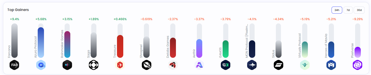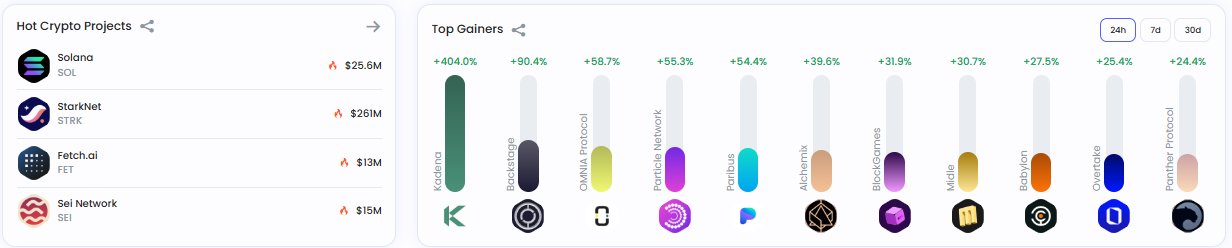 상승률 상위 프로젝트는 ▲카데나 +404.0% ▲백스테이지 +90.4% ▲옴니 프로토콜 +58.7% ▲파티클 네트워크 +55.3% ▲파리버스 +54.4% ▲알케믹스 +39.6% 등이다.