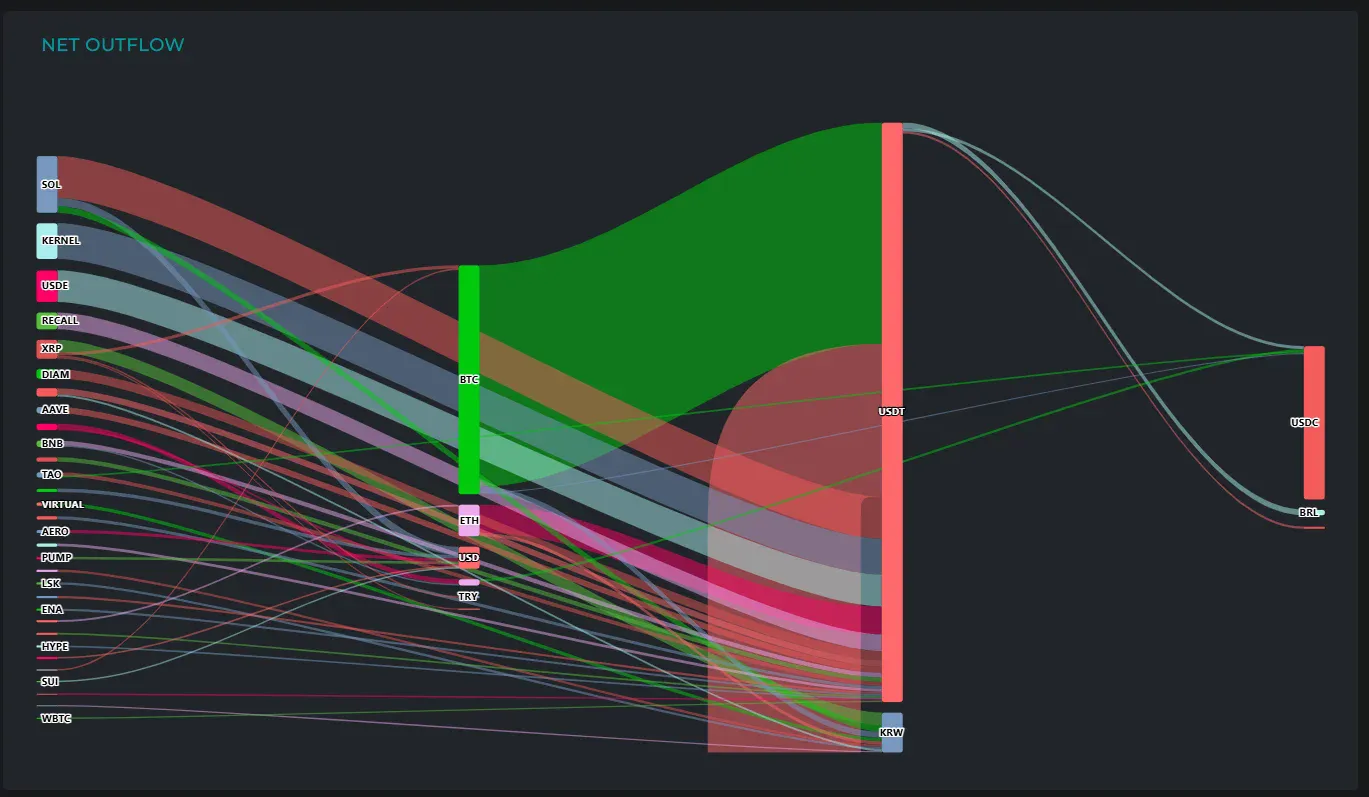 SOL에서는 총 6090만 달러가 유출되며 ▲USDT(4400만 달러) ▲달러화(870만 달러) ▲원화(690만 달러) 순으로 분산됐다.