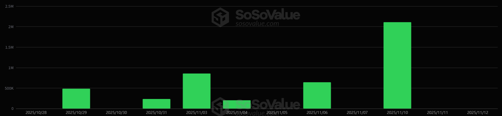 지난달 28일 거래 개시 이후 단 한 차례의 유출 없이 자금이 꾸준히 들어오며 누적 순유입 규모는 3억6852만 달러로 확대됐다.