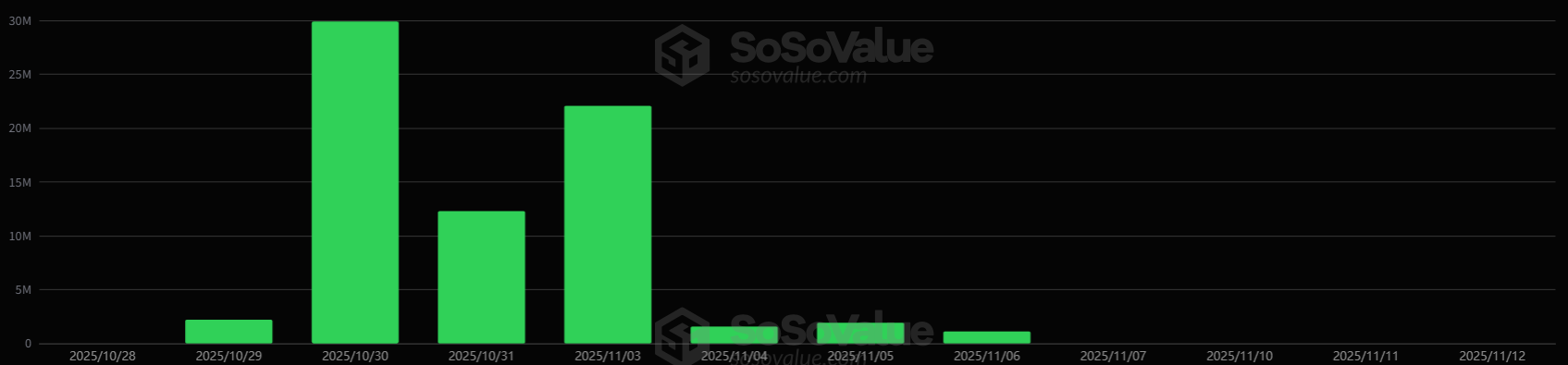 지난 6일 111만 달러 유입을 끝으로 7거래일 연속 순유입이 종료됐다. 지난 7일부터 이날까지 3거래일 연속 추가 유입·유출 없이 흐름이 고정된 상태다. 현재 누적 순유입 규모는 7105만 달러로 유지되고 있다.