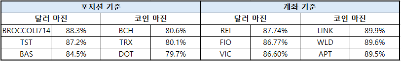 상위 트레이더 기준 종목별 포지션 비중을 보면, 포지션 기준 달러 마진 시장에서는 BROCCOLI714(88.3%), TST(87.2%), BAS(84.5%) 순으로 롱 포지션 비중이 높았다. 코인 마진 시장에서는 BCH(80.6%), TRX(80.1%), DOT(79.7%)이 상위권을 차지했다.