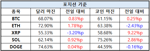 XRP는 달러 마진 78.68%(+1.91%p), 코인 마진 82.76%(–0.37%p)로, 전반적으로 높은 롱 비중을 유지했다.