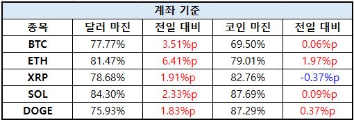 도지코인은 달러 마진 75.93%(+1.83%p), 코인 마진 87.29%(+0.37%p)로, 두 시장 모두에서 안정적인 흐름을 보였다.