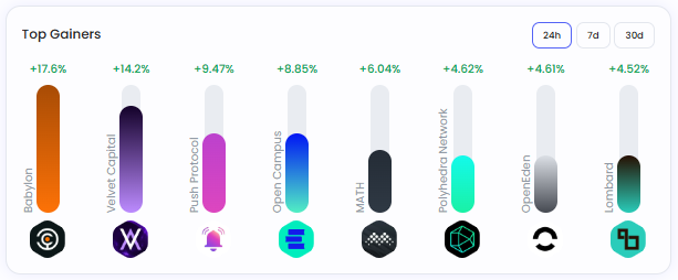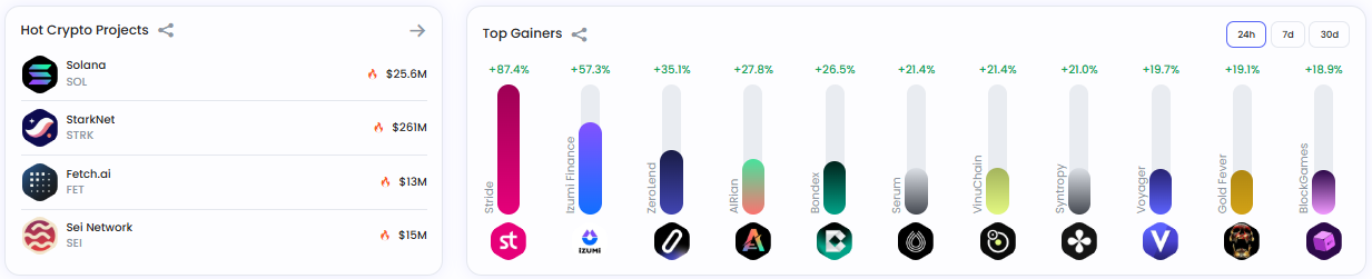 상승률 상위 프로젝트는 ▲스트라이드 +87.4% ▲아이주미 파이낸스 +57.3% ▲제타랜드 +35.1% ▲알라 +27.8% ▲벤덱스 +26.5% ▲서럼 +21.4% 등이다.