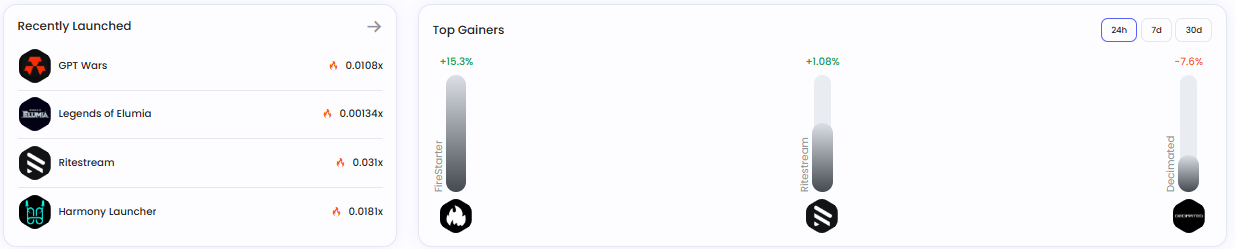 최근 해당 플랫폼에서 출시된 프로젝트는 ▲GPT 워즈(0.0108x) ▲일루미아 레전드(0.00134x) ▲라이트스트림(0.031x) ▲하모니 런처(0.018x) 으로 확인됐다.
