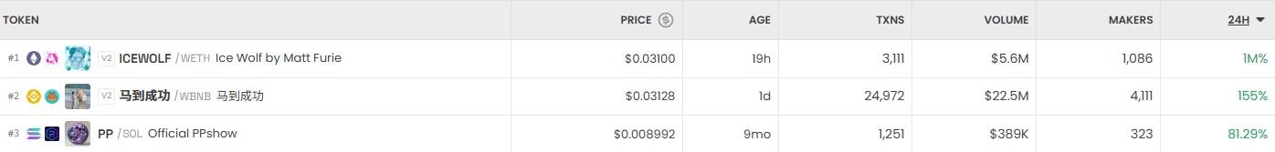 하루 동안 DEX에서 가장 크게 오른 거래쌍은 ICEWOLF/WETH(Ice Wolf by Matt Furie)로, 0.03100달러에 거래되며 1M% 상승했다. 이어 马到成功/WBNB(马到成功)가 0.03128달러에 거래되며 155% 급등했고 PP/SOL(Official PPshow)은 0.008992달러에 형성되며 81.29% 올랐다.