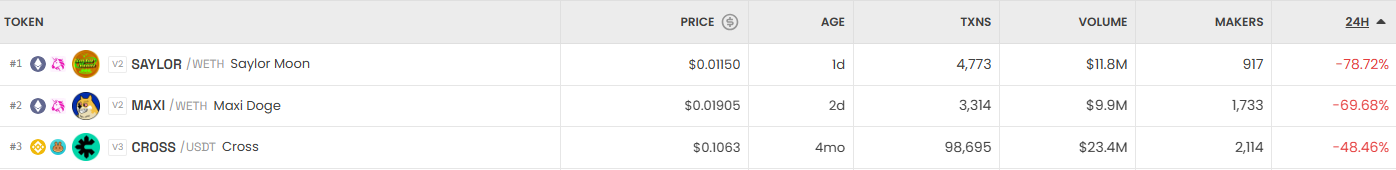반면 가장 크게 하락한 거래쌍은 SAYLOR/WETH(Saylor Moon)으로, 0.01150달러에 거래되며 78.72% 하락했다. 이어 MAXI/WETH(Maxi Doge)가 69.68%, CROSS/USDT(Cross)가 48.46% 떨어지며 약세를 보였다.
