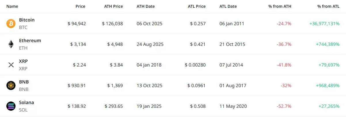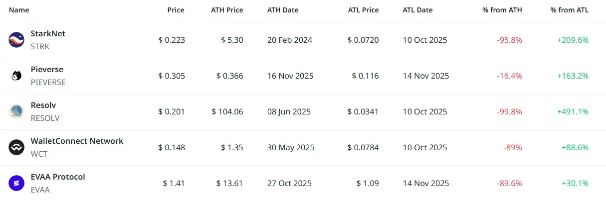 [편집자주] 암호화폐 시장은 하루 새 고점과 저점이 빠르게 바뀌는 고변동성 환경이다. 역대 최고가(ATH)와 역대 최저가(ATL) 경신 종목을 추적하면 강세와 약세 흐름을 조기에 포착할 수 있다. 크립토랭크 기준 시가총액 1000만 달러 이상 종목 중 하루 사이 고점 또는 저점을 경신한 주요 토큰을 정리하고 시가총액 상위 종목과 실시간 국내 인기 자산의 고점 대비 조정률을 함께 분석해 시장 회복 여력과 흐름을 진단한다.