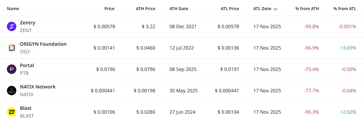 이 외에도 ▲캠프 네트워크(CAMP) ▲게임빌드(GAME) ▲플룸 네트워크(PLUME) ▲핀링크(PIN) ▲화이트록(WHITE) ▲모리 코인(MORI) ▲센드(SEND) 12개 종목이 신저점을 경신했다. 젠트리는 2021년 12월 기록한 역대 최고가 3.22달러 대비 99.8% 하락한 수준에서 거래되고 있으며, 포털과 나틱스 네트워크도 각각 ATH 대비 75.4%, 77.7% 급락하며 장기 약세를 이어가고 있다. 반면 핀링크는 ATL 대비 4.95% 반등하며 단기 저점 탈출 시도를 보였다.