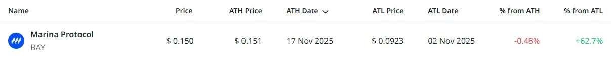 마리나 프로토콜은 11월 17일 신고점을 기록했으며, 11월 2일 기록한 저점 대비 62.7% 상승한 가격에 거래되고 있다. 전체 1개 종목이 신고점을 경신했다.