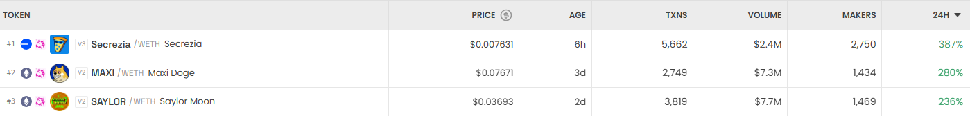 하루 동안 DEX에서 가장 크게 오른 거래쌍은 Secrezia/WETH(Secrezia)로, 0.007631달러에 거래되며 387% 상승했다. 이어 MAXI/WETH(Maxi Doge)가 0.07671달러에 거래되며 280% 급등했고 SAYLOR/WETH(Saylor Moon)은 0.03693달러에 형성되며 236% 올랐다.