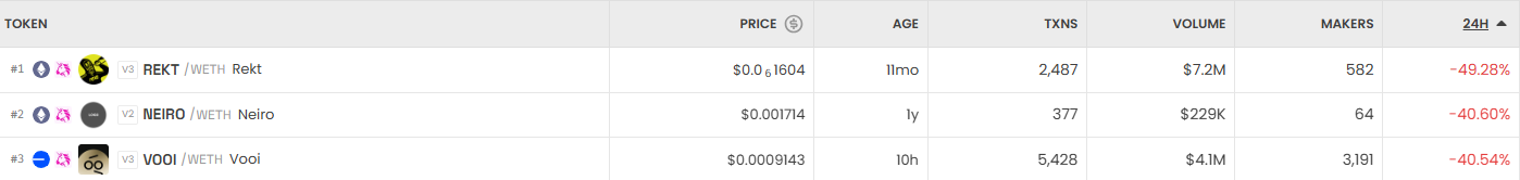 반면 가장 크게 하락한 거래쌍은 REKT/WETH(Rekt)으로, 0.0001604달러에 거래되며 49.28% 하락했다. 이어 NEIRO/WETH(Neiro)가 40.60%, VOOI/WETH(Vooi)가 40.54% 떨어지며 약세를 보였다.