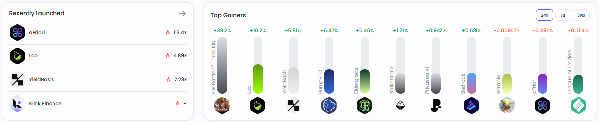 최근 해당 플랫폼에서 출시된 프로젝트는 ▲ 어프라이어(53.4x) ▲ 랩(4.89x) ▲ 일드베이시스(2.23x) ▲ 클링크파이낸스(-) 로 확인됐다.