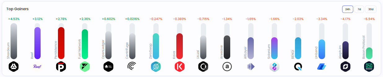 24시간 기준 변동률은 ▲ 삼국지AI(+39.2%) ▲ 랩(+10.2%) ▲ 일드베이시스(+6.85%) ▲ 펌프BTC(+5.47%) ▲ 엘도리지(+5.46%) ▲ 슬릭스톤(+1.21%)으로 나타났다.