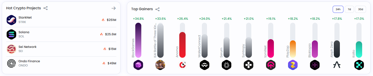 상승률 상위 프로젝트는 ▲블록게임즈 +34.8% ▲카이 배틀 오브 쓰리 킹덤즈 +33.6% ▲아노마 +26.4%