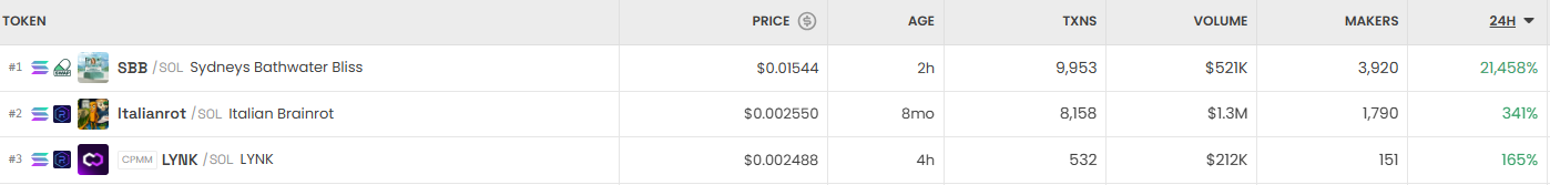 하루 동안 DEX에서 가장 크게 오른 거래쌍은 SBB/SOL(Sydneys Bathwater Bliss)로, 2시간 만에 21,458% 폭등하며 0.01544달러에 거래됐다. 이어 Italianrot/SOL(Italian Brainrot)이 0.002550달러에 거래되며 341% 상승했고, LYNK/SOL(LYNK)은 0.002488달러로 165% 오르며 상위권에 올랐다.