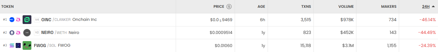 반면 가장 크게 하락한 거래쌍은 OINC/CLANKER(Onchain Inc)로, 46.14% 급락하며 0.59469달러에 거래됐다. 이어 NEIRO/WETH(Neiro)가 44.49% 하락했고, FWOG/SOL(FWOG)은 0.01060달러에 거래되며 24.39% 떨어졌다.