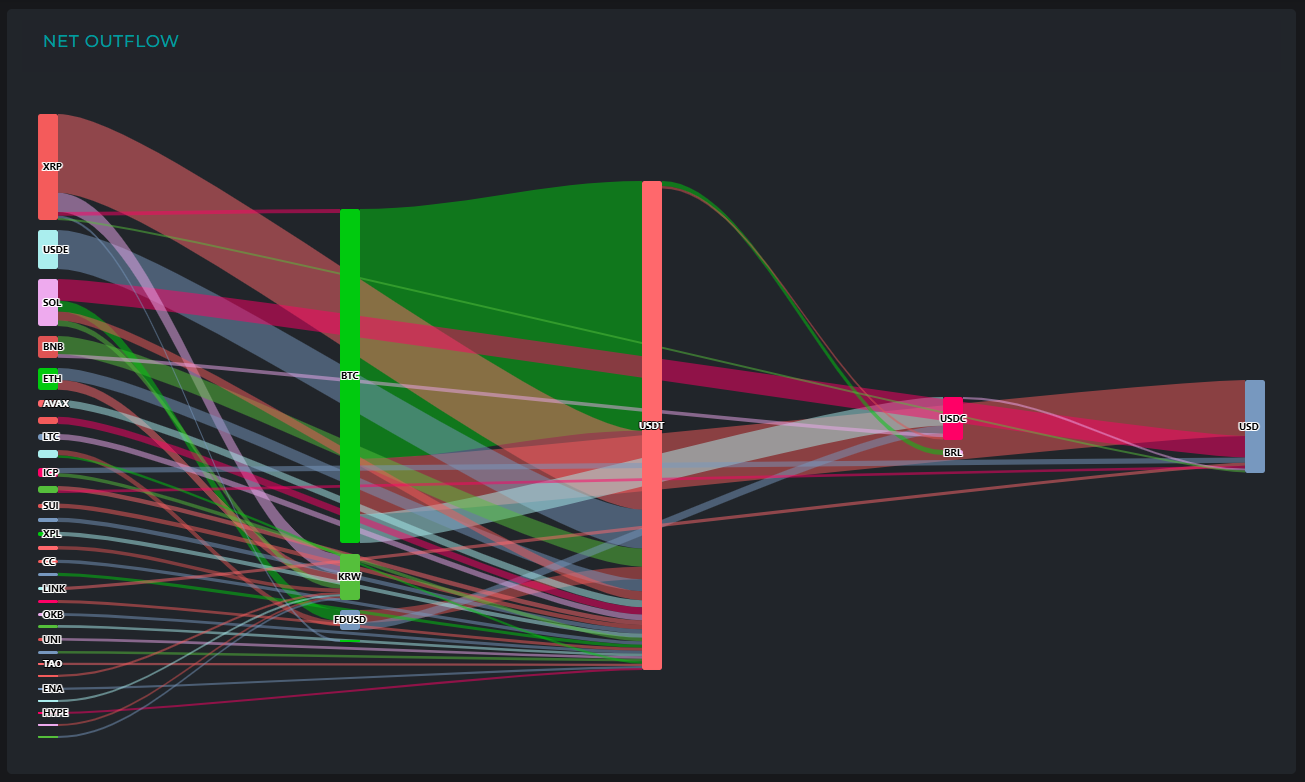 XRP에서 총 1억1110만 달러 규모의 대규모 자금 유출이 발생했다. 자금은 ▲USDT 8230만 달러 ▲원화 2020만 달러 ▲BTC 410만 달러 ▲달러화 200만 달러 ▲리라화 250만 달러로 이동했다.