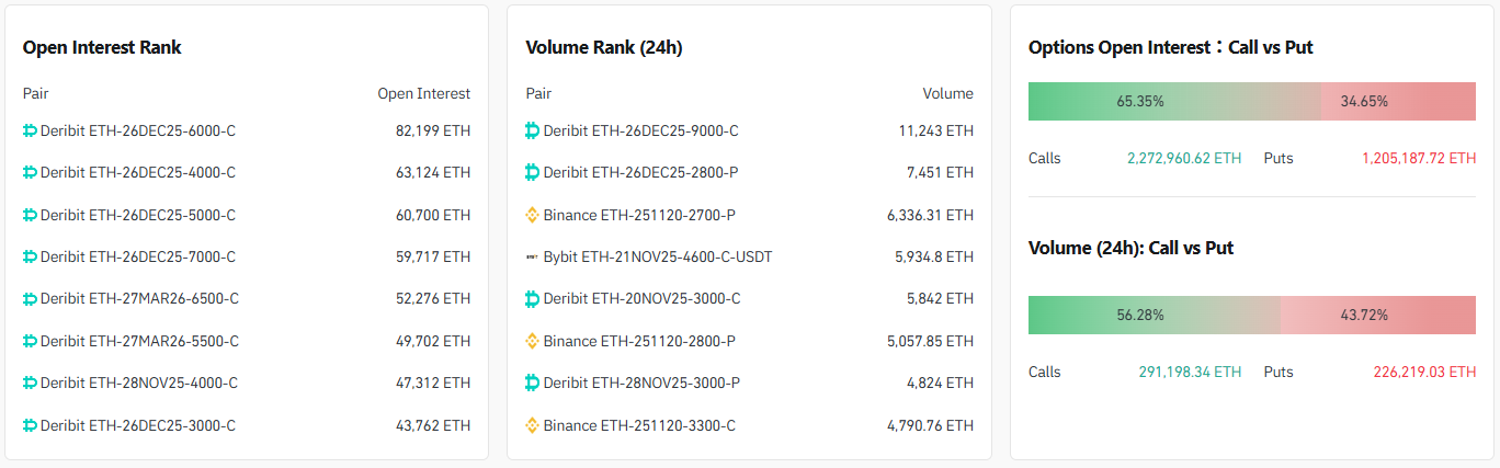 24시간 거래량 기준 상위 계약은 ▲9000달러 콜옵션(12월 26일) ▲2800달러 풋옵션(12월 26일) ▲2700달러 풋옵션(11월 20일, 바이낸스) 순으로 확인됐다.