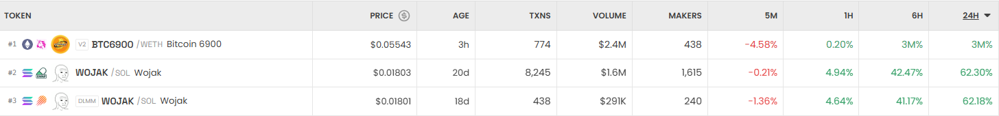 하루 동안 DEX에서 가장 크게 오른 거래쌍은 BTC6900/WETH(Bitcoin 6900)으로, 0.05543달러에 거래되며 24시간 기준 300만 % 상승했다. 이어 WOJAK/SOL(Wojak)은 0.01803달러로 24시간 기준 62.30% 올랐고, WOJAK/SOL(Wojak·DLMM 버전)은 0.01801달러에 거래되며 62.18% 상승했다.