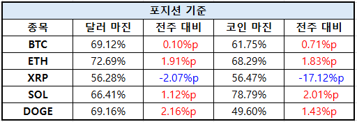솔라나는 달러 마진 79.11%(–2.81%p), 코인 마진 86.84%(–0.70%p)로 높은 수준을 유지했으나 하락세였다. 도지코인은 달러 마진 74.54%(+0.48%p), 코인 마진 86.80%(–1.06%p)로 엇갈린 흐름을 보였다.