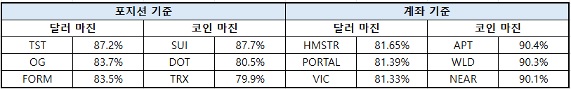 상위 트레이더 기준 종목별 포지션 비중을 보면 포지션 기준 달러 마진 시장에서는 TST(87.2%), OG(83.7%), FORM(83.5%) 순으로 롱 포지션 비율이 높았다. 코인 마진 시장에서는 SUI(87.7%), DOT(80.5%), TRX(79.9%)가 상위권을 차지했다.