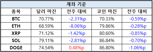 이더리움은 달러 마진 68.59%(–8.06%p), 코인 마진 79.86%(–0.28%p)로 크게 둔화됐다. XRP는 달러 마진 71.12%(–1.42%p), 코인 마진 80.60%(–0.85%p)로 모두 하락했다.