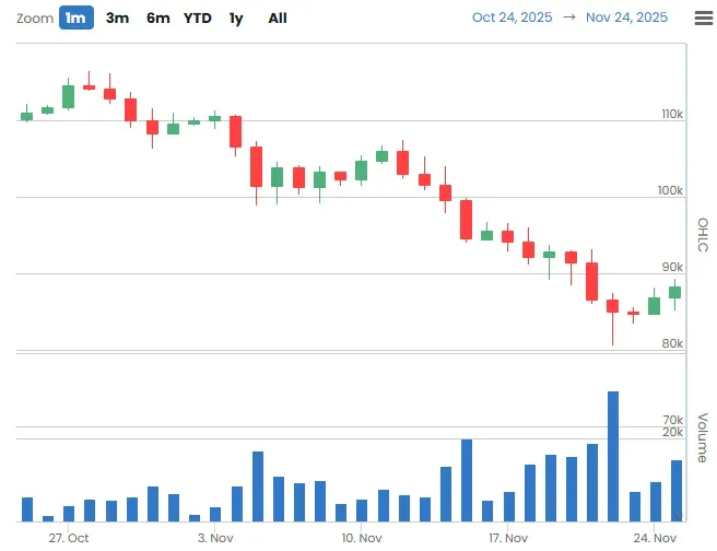 코이니지에 따르면 코인베이스 프라임의 비트코인 거래량은 11월 24일(UTC 기준) 약 1만4944.72BTC로 집계됐다. 이는 전일(11월 23일) 기록한 9786.33BTC 대비 대폭 증가한 수치로, 하루 만에 약 +52.7% 늘어난 흐름이다. 달러 기준 24시간 거래량은 사이트 표시 기준 약 4억1530만 달러 수준으로 나타났다.