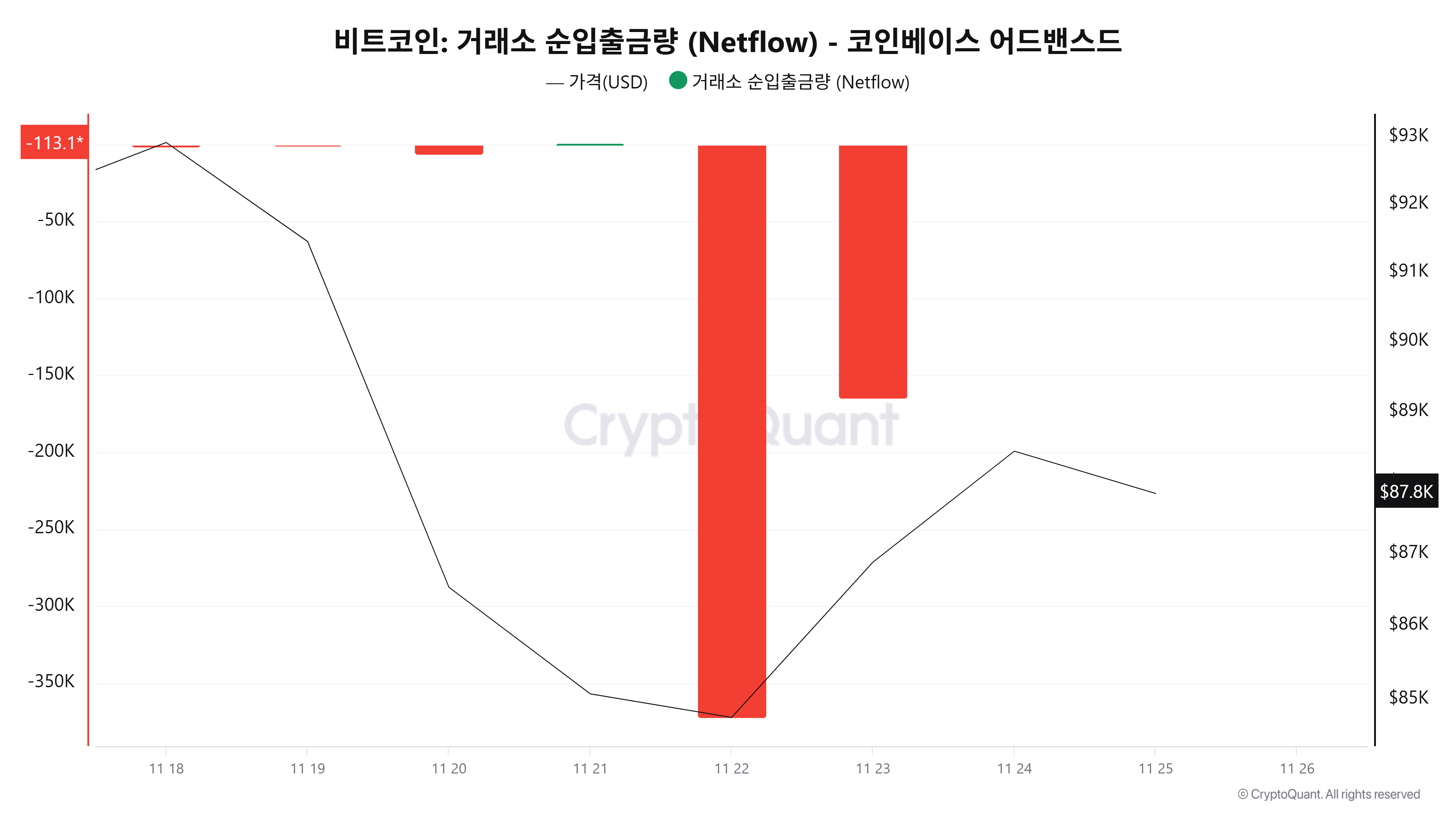 크립토퀀트 데이터에 따르면 25일(UTC 기준, 미완결) 코인베이스 비트코인 순입출금(Netflow)은 –113.15BTC 순유출을 기록했다.