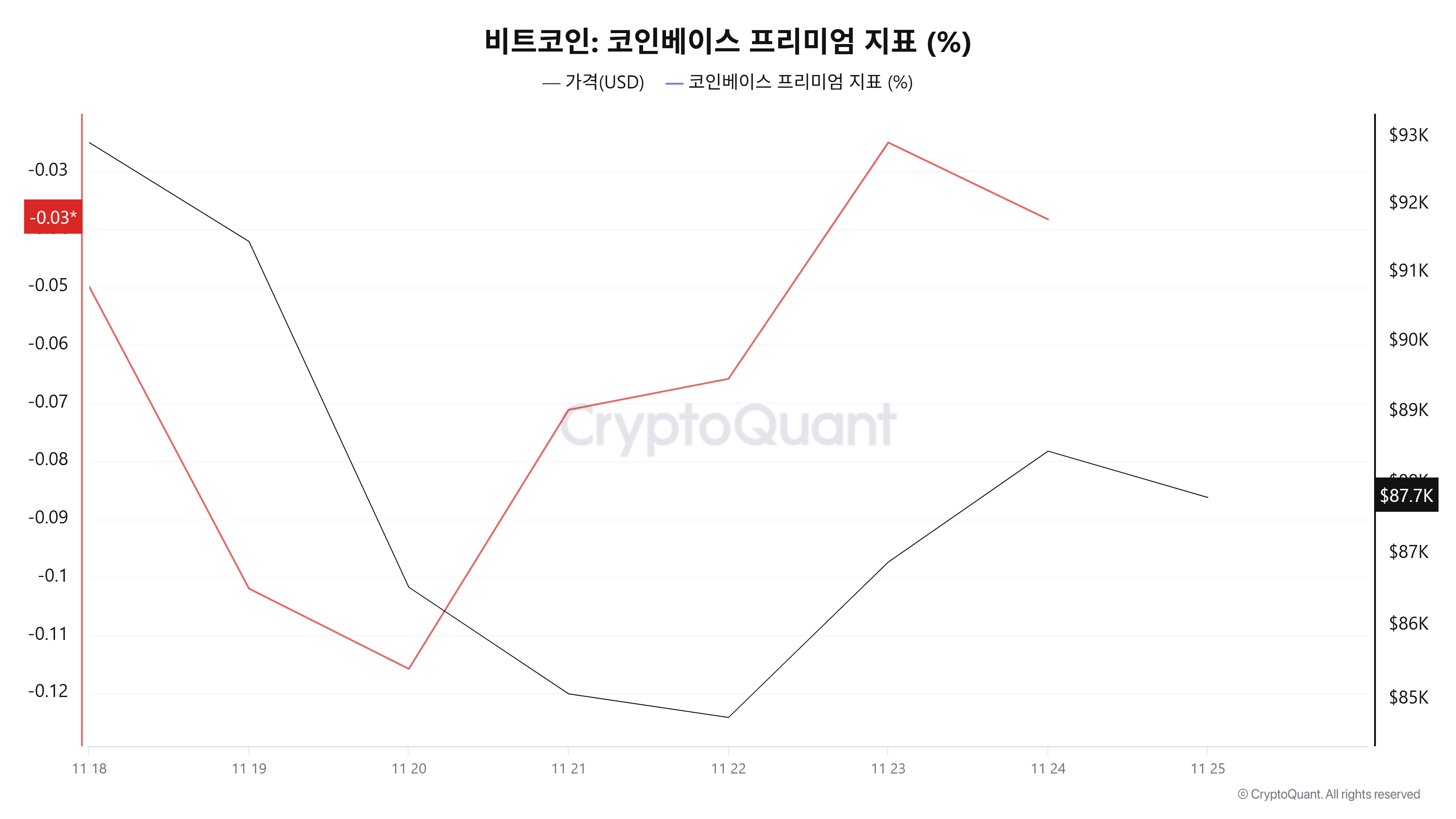 최근 일주일간 흐름을 보면 ▲18일 –0.0499% ▲19일 –0.1019% ▲20일 –0.1158% ▲21일 –0.0711% ▲22일 –0.0657% ▲23일 –0.0250% ▲24일 –0.0383% 등 일주일 내내 음(–)의 프리미엄이 유지되며 코인베이스 가격이 글로벌 평균 대비 할인 상태를 벗어나지 못했다.