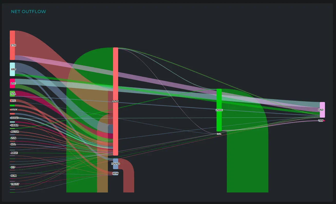 BTC와 USDT로 자금이 집중되고 ETH·XRP·ZEC 등 주요 알트에서 대규모 유출이 발생하며 시장이 뚜렷한 양극화 흐름 속에서 새로운 수급 구조를 형성하고 있다.