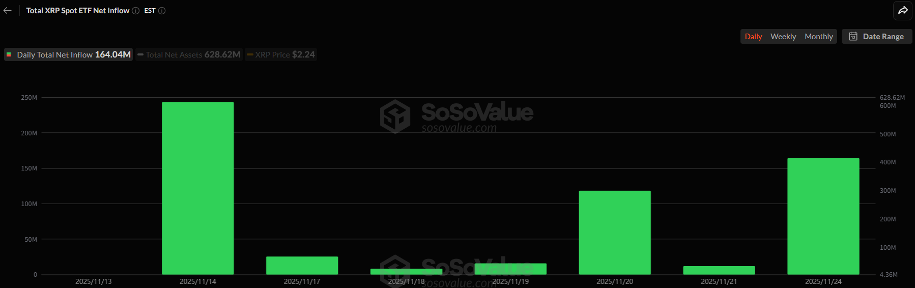 XRP 현물 ETF 시장에서는 총 1억6404만 달러 규모의 순유입이 발생했다. 지난 14일(2억4305만 달러) 이후 7거래일 연속 유입 흐름이 유지되며 누적 순유입 규모는 5억8670만 달러로 증가했다.