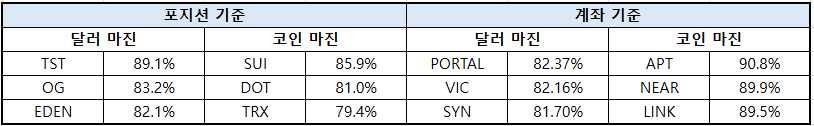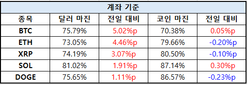 솔라나는 달러 마진 68.20%(+1.79%p), 코인 마진 78.64%(–0.15%p)로 높은 비중을 유지하고 있다. 도지코인은 달러 마진 68.12%(–1.04%p), 코인 마진 49.34%(–0.26%p)로 다소 약화됐다.