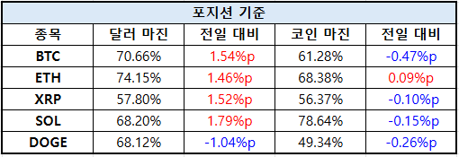 솔라나는 양 시장에서 모두 긍정적이었다. 달러 마진 81.02%(+1.91%p), 코인 마진 87.14%(+0.30%p)로 강한 매수 우위를 유지했다. 도지코인도 달러 마진 75.65%(+1.11%p), 코인 마진 86.57%(–0.23%p)로 전반적 안정세를 보였다.