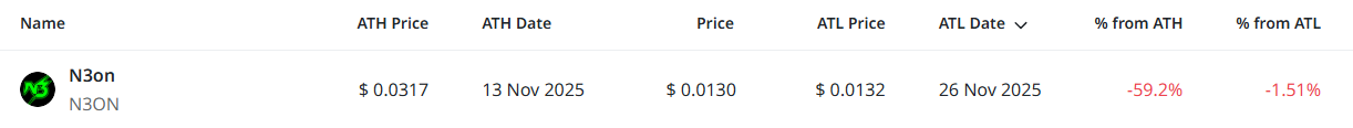 제공된 데이터에서는 N3온 한 종목만 집계됐다. 최근 기록한 사상 최저가(ATL) 대비 소폭 하락한 수준에서 움직이며 약세 흐름이 이어지고 있다. 전체적으로 신저점 근처에서 거래되는 종목이 제한적이지만, 해당 자산은 단기 매도 압력이 상대적으로 크게 작용한 것으로 나타났다.