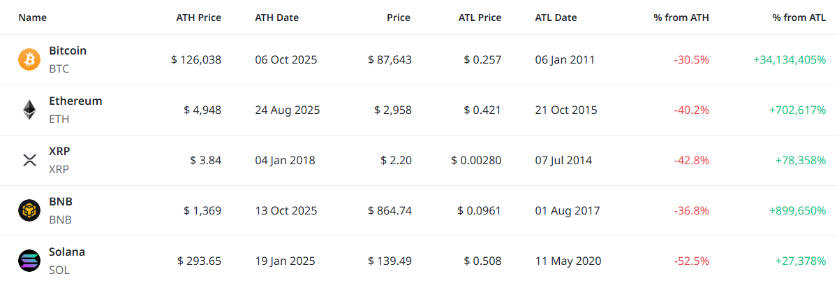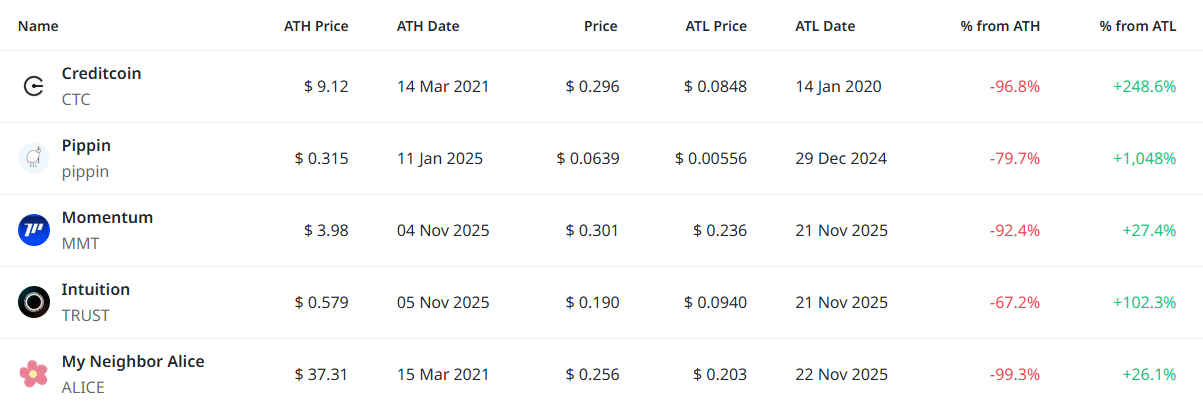 [편집자주] 암호화폐 시장은 하루 새 고점과 저점이 빠르게 바뀌는 고변동성 환경이다. 역대 최고가(ATH)와 역대 최저가(ATL) 경신 종목을 추적하면 강세와 약세 흐름을 조기에 포착할 수 있다. 크립토랭크 기준 시가총액 1000만 달러 이상 종목 중 하루 사이 고점 또는 저점을 경신한 주요 토큰을 정리하고 시가총액 상위 종목과 실시간 국내 인기 자산의 고점 대비 조정률을 함께 분석해 시장 회복 여력과 흐름을 진단한다.