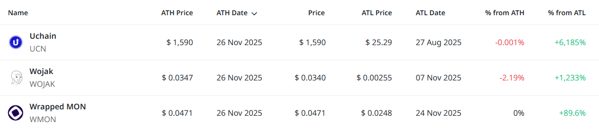 제공된 데이터에서는 총 3개 종목이 신고점을 경신했다. 유체인과 래퍼드몬은 신고가와 동일한 가격을 유지하며 강한 매수세가 이어졌고, 워작 역시 소폭 조정을 보였으나 최고가 근처에서 움직이며 투자자 관심이 유지되는 모습이다. 전체적으로 소수 알트코인에 자금이 집중되면서 특정 테마·커뮤니티 기반 토큰이 단기 강세를 주도한 것으로 분석된다.