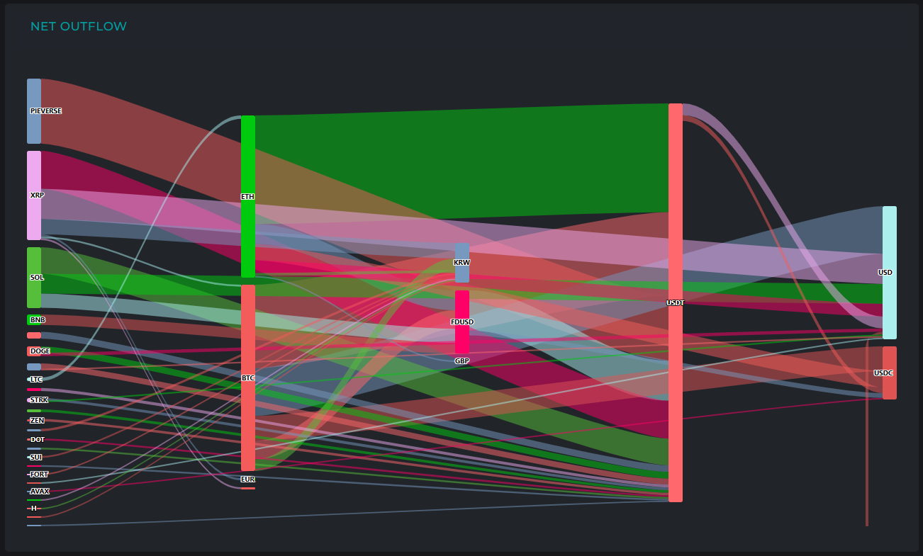 XRP에서는 7430만 달러가 빠져나갔다. 이 중 ▲USDT 3150만 달러 ▲USD 2500만 달러 ▲KRW 1290만 달러 ▲BTC 150만 달러 ▲EUR 170만 달러 ▲JPY 150만 달러로 이동하며 여러 법정화폐·메이저 자산으로 분산 유출됐다.